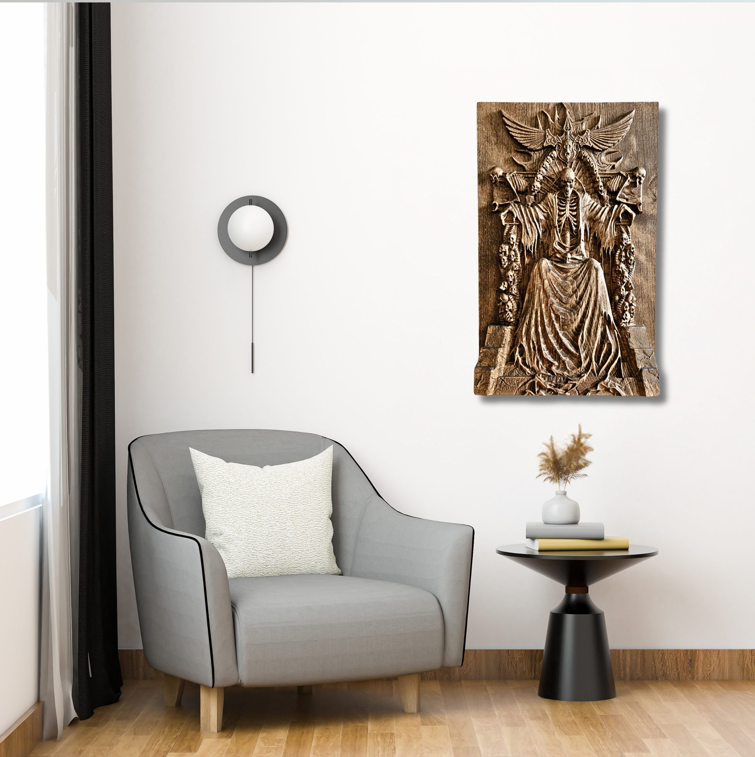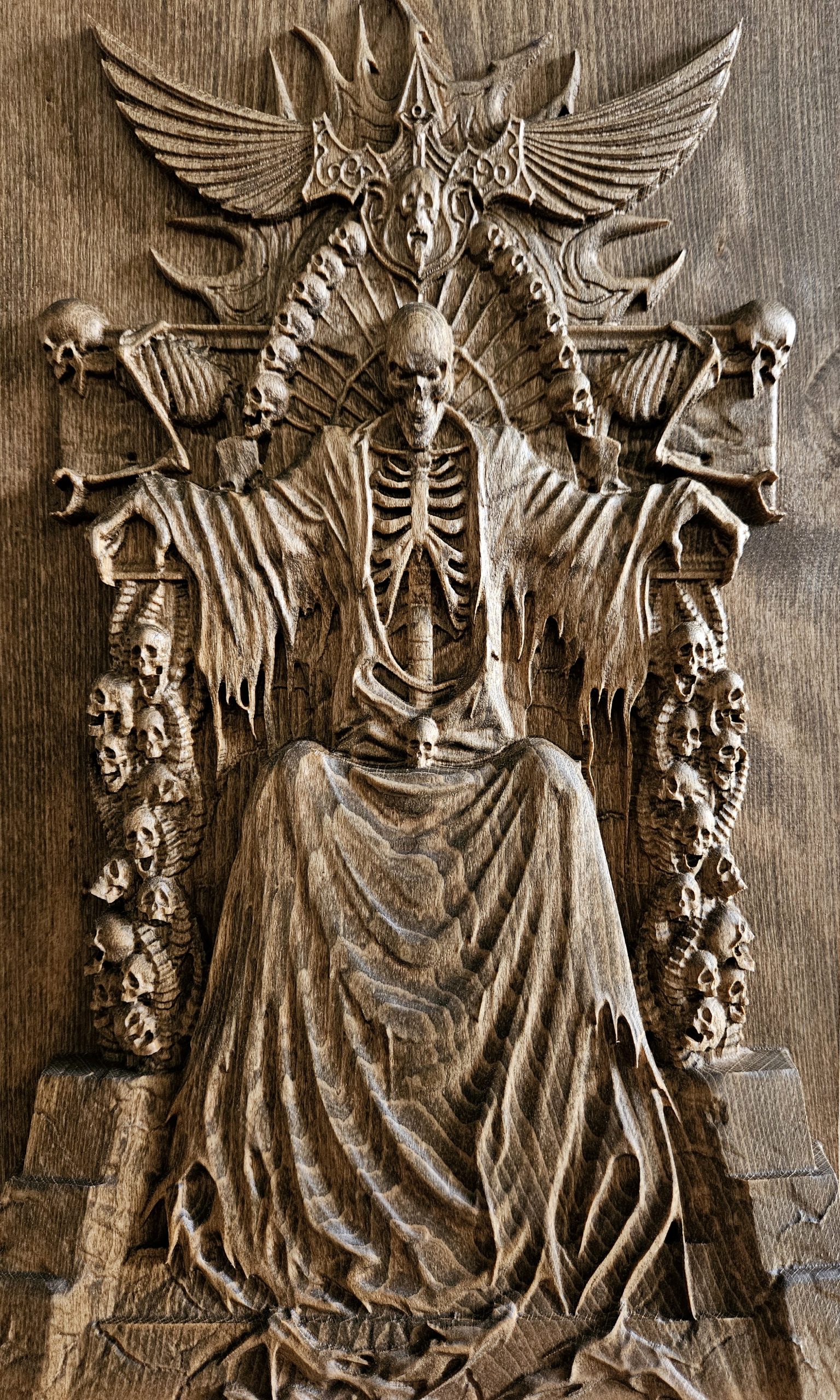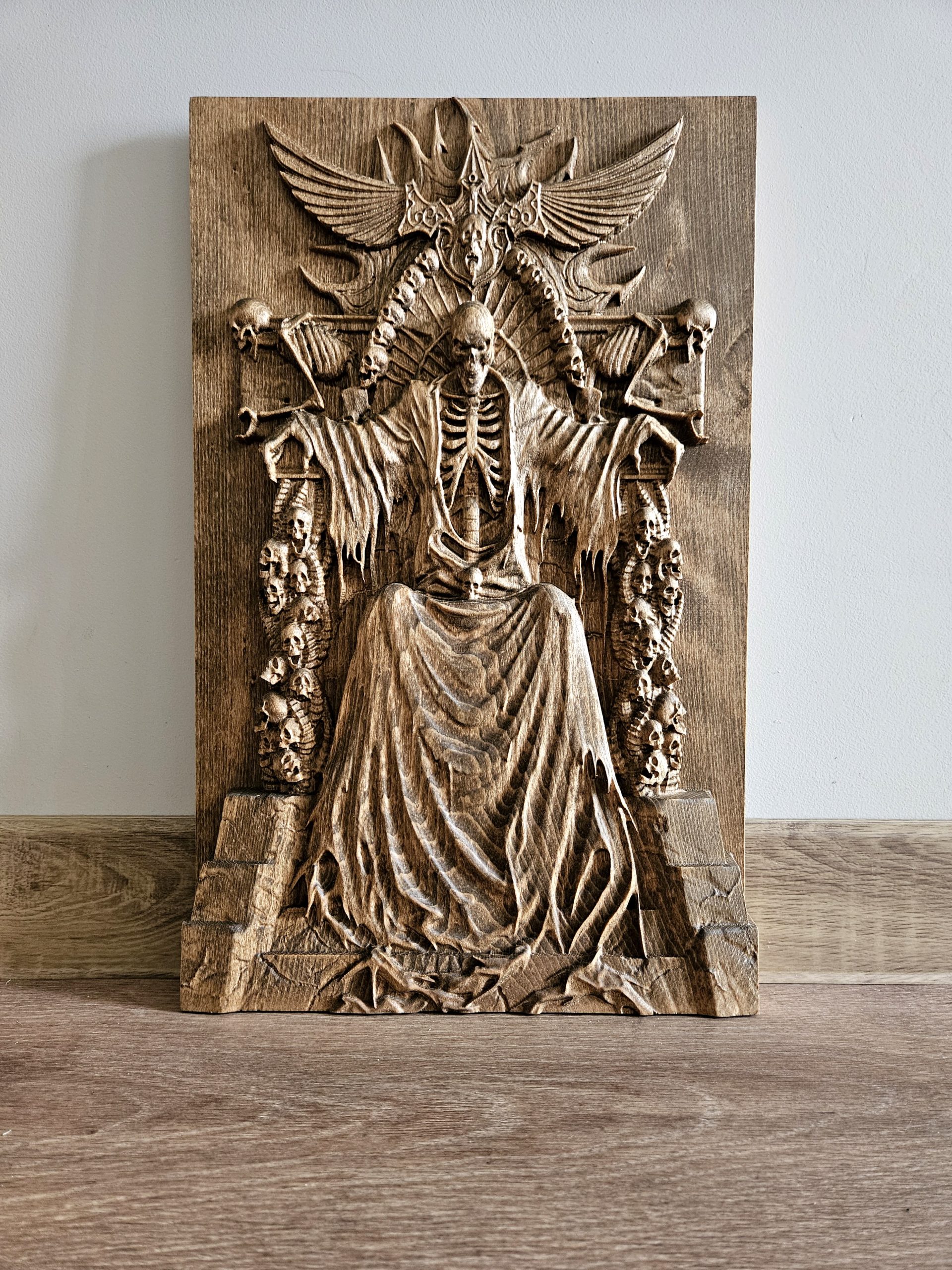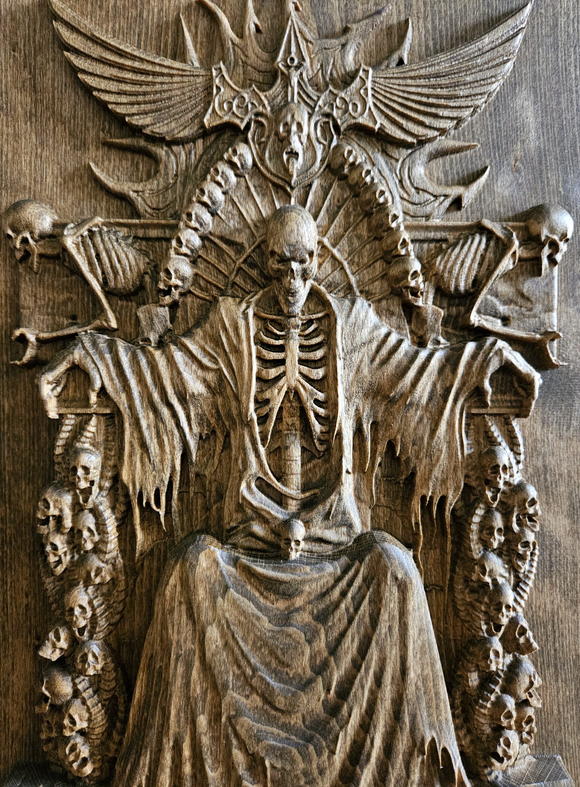 Темата: Владетел на отвъдното – скелет на трон от черепи и мечове, с разперени криле зад гърба си. Всеки детайл носи внушение и сила. Материал: Пропарен бук – издръжлив и красив естествен материал Финиш: Био масла с твърда вакса, които подчертават структурата на дървото и го защитават дългосрочно Производство: – CNC фрезоване за максимална прецизност – Ръчно довършване за изостряне на детайли и постигане на дълбочина – Всяко копие минава през индивидуална обработка Предлагани размери: 20 x 30 x 3.5 см 25 x 40 x 3.5 см 30 x 50 x 3.5 см (Възможна е и изработка по поръчка) Това…